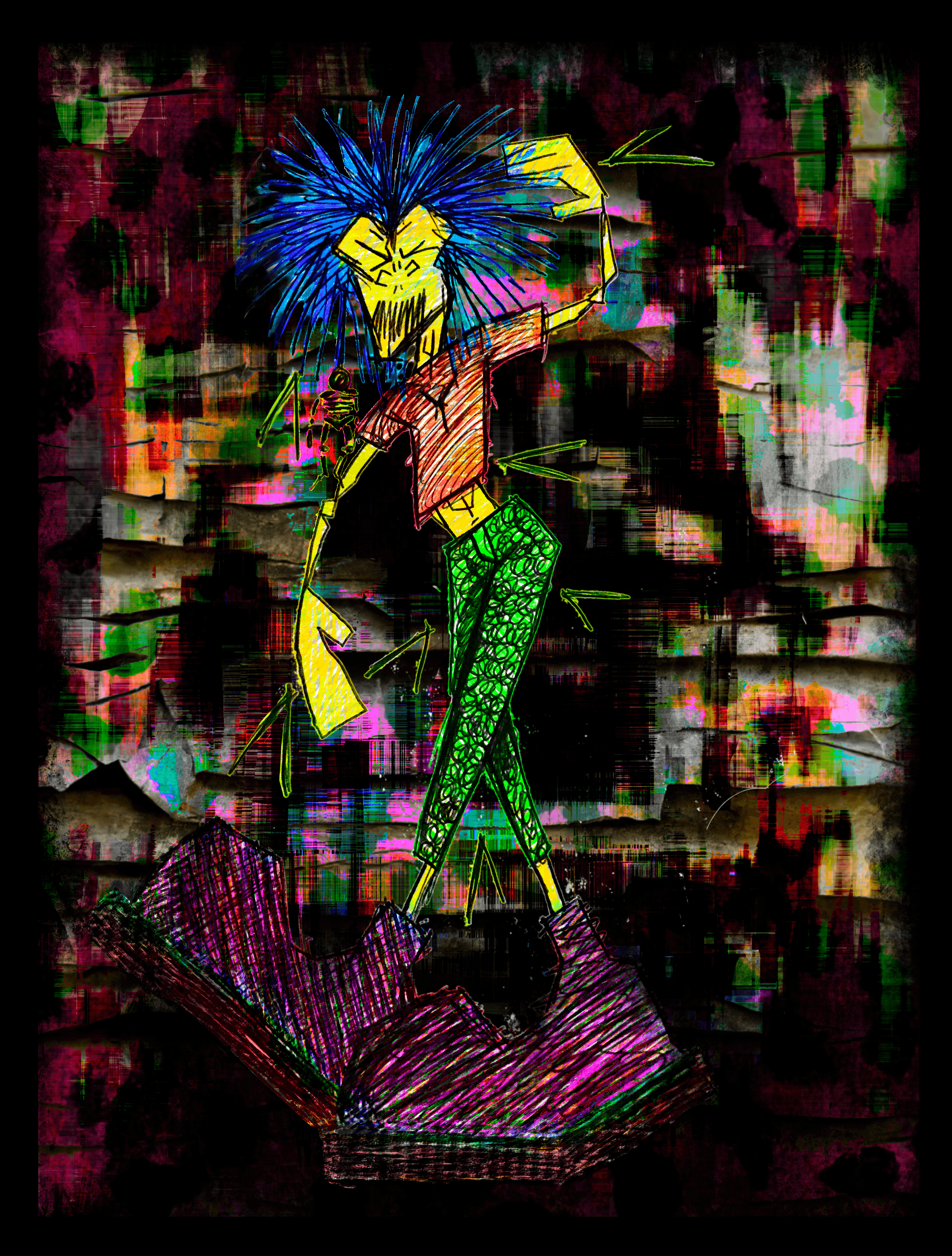 Give me money, give me sex, give me food and cigarettes. Oh what to do, not to feel and who are you? Inspired by dancing to the song "Baby Turns Blue" by the Virgin Prunes. This original Biro sketch was created in 1982 in Angie's sketchbook. Brought to life in 2022 with some digital inking. Minted in 2023. It only took 43 years to make.
