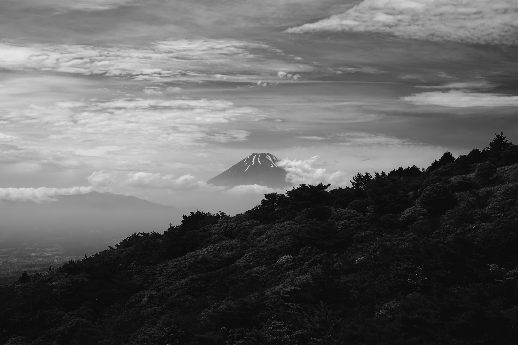As the clouds gently parted and the forest held its breath, Mount Fuji emerged — solemn, timeless, and watching quietly from afar.