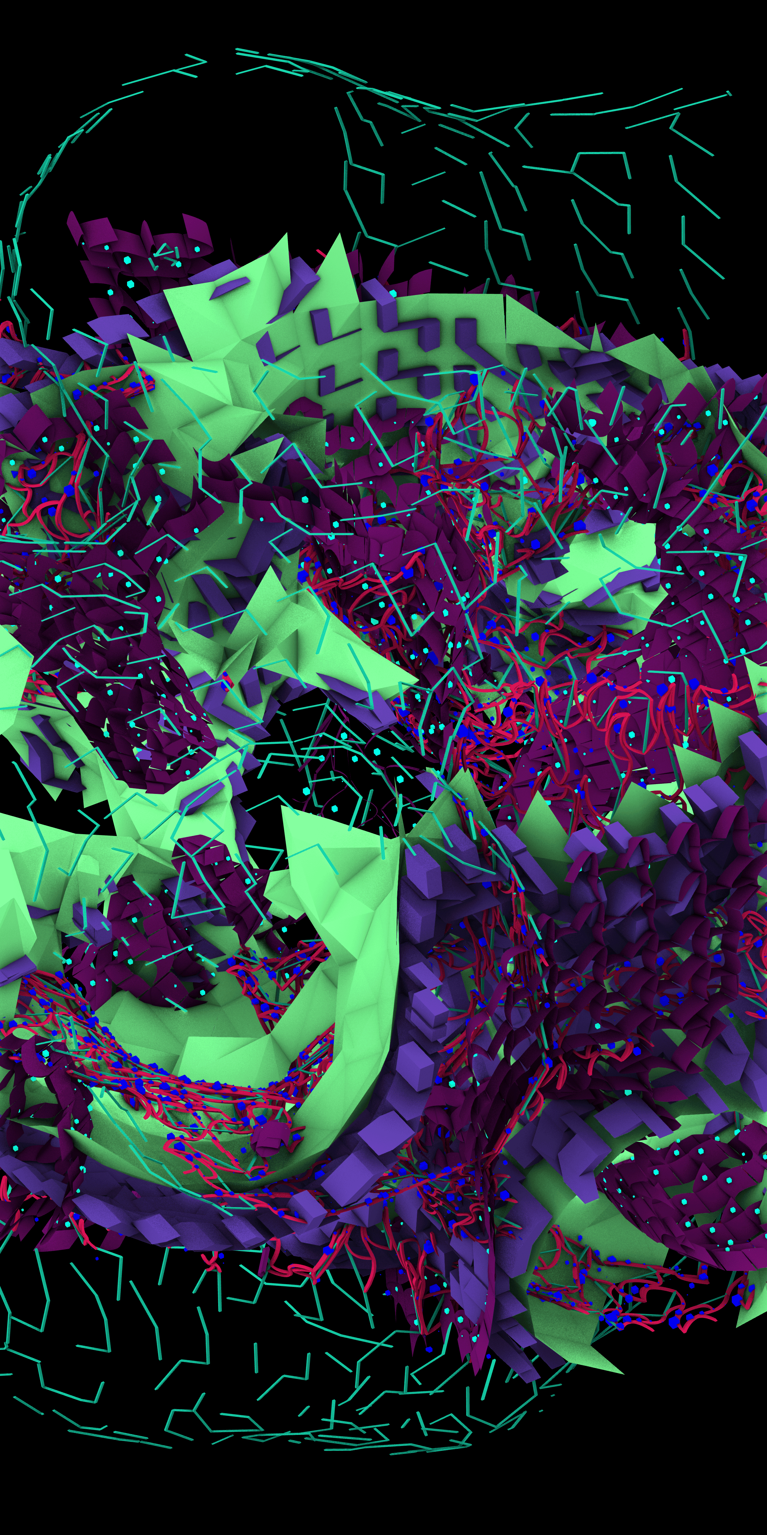Custom transformations of three iso-surfaces [ISF] are based on evaluation of random ellipsoid paths. Faces are 'turned' to micro-cubes in connection with re-parametrized line segments. Volume is subtracted with hexagonal prism. 3D extrusion.